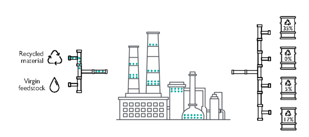 Virgin and recycled feedstocks cannot be physically separated once they are co-fed into production installations. Since it is impractical to build an entirely new stand-alone infrastructure to produce plastics solely from recycled waste, we need to make use of the existing facilities.