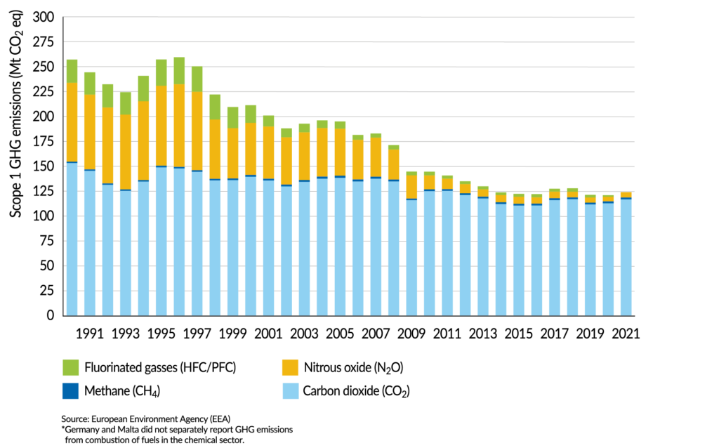 This reduction was heavily driven by the reduction of process emissions (-61%), mainly due to a significant decrease of nitrous oxide (N2O) and fluorinated gases emissions. The decline of nitrous oxide (N2O) emissions, which has a higher global warming potential than carbon dioxide (CO2) and methane (CH2), was mainly due to technological changes in the production processes. Technological improvements in the production of nitric and adipic acid, for example, explain that almost 50% of the total reduction since 1990 occurred in a brief period of 3 years (2007-2010). For fluorinated gases, this reduction was a result of phase-out of production of fluorochemicals. By 2021, the two groups of GHG gases have reached a reduction of 95%.