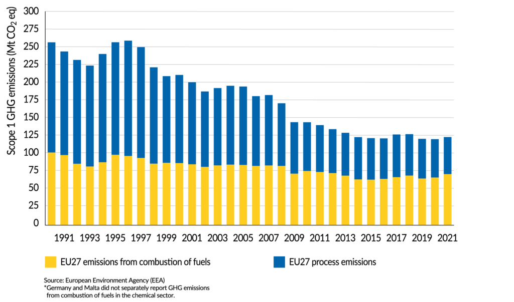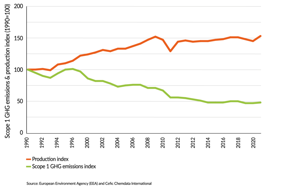 To limit the increase of the global average temperature to well below 2°C, and preferably 1.5°C, above pre-industrial levels, in line with the Paris agreement, it is necessary to reduce the world’s absolute greenhouse gas emissions. The chemical industry actively monitors its Scope 1 and Scope 2 GHG emissions to track progress in GHG emissions reduction. Scope 3 GHG emissions at the sectoral level have not been fully assessed due to the industry’s diverse product portfolios and complex value chains.