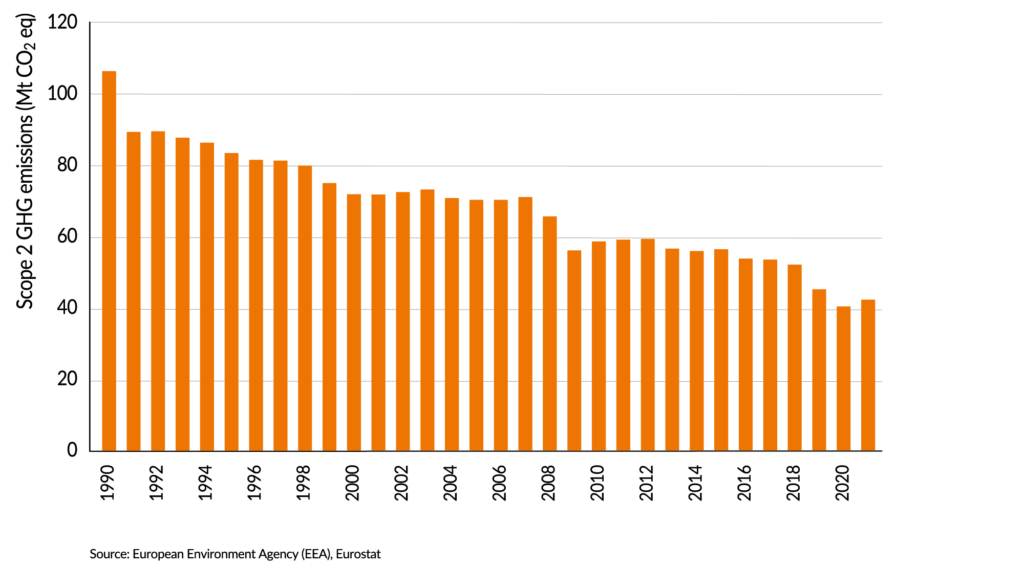 Scope 2 emissions, estimated based on electricity consumption and location-based emission factors, decreased by 60% from 1990 to2021. This was driven by a 14% drop in electricity consumption by the sector, and a transition to low-carbon emissions and renewable electricity sources in the EU member states.