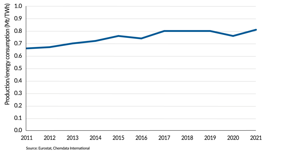The energy efficiency of the European chemical industry improved over the period 2006-2021, with a 22% increase. Global economic crises in 2016 and 2020 had a negative impact on the energy efficiency of the production processes. During crises, decreased production can lead to sub-optimal operation of installations , affecting energy efficiencies. This is confirmed by lower production volumes in weight in 2019 and 2020.