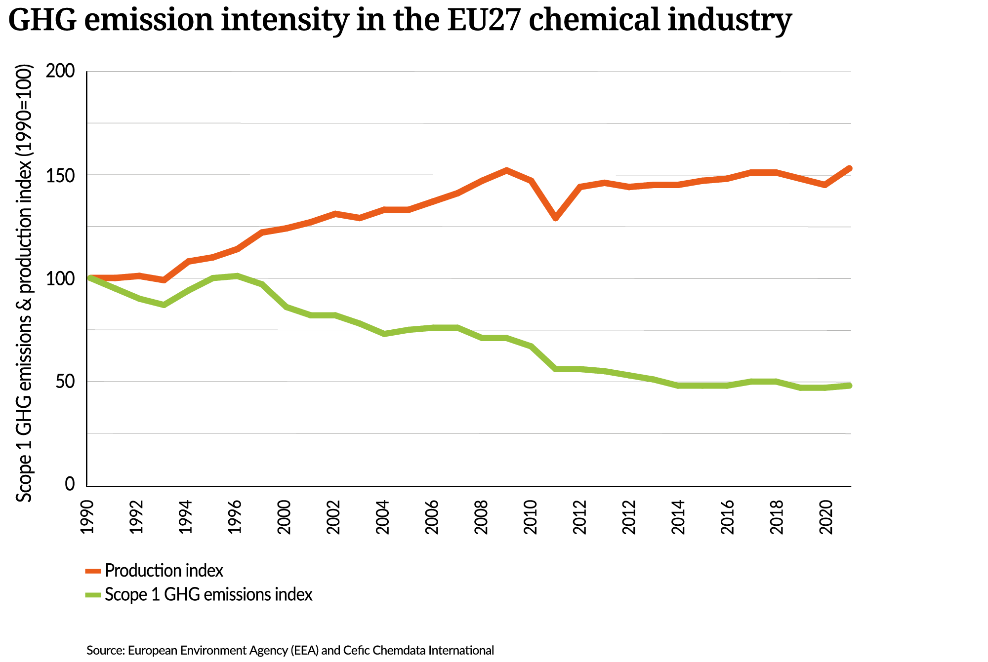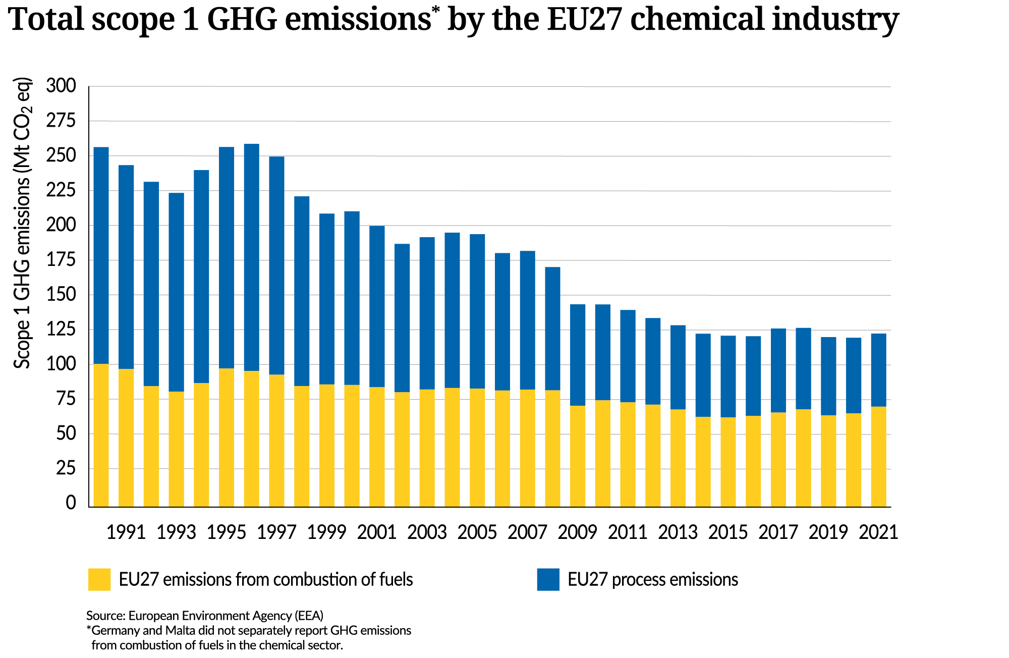 The Paris Agreement requires tremendous efforts from all sectors to combat climate change. The transition to a lower-carbon emissions economy creates opportunities and challenges. The European chemical industry wants to seize the opportunities arising from this transition. Further reduction of its greenhouse gas (GHG) emissions requires investments and continued innovation in technologies to further improve energy efficiency and further increase sustainable renewable energy and the use of alternative feedstock.
