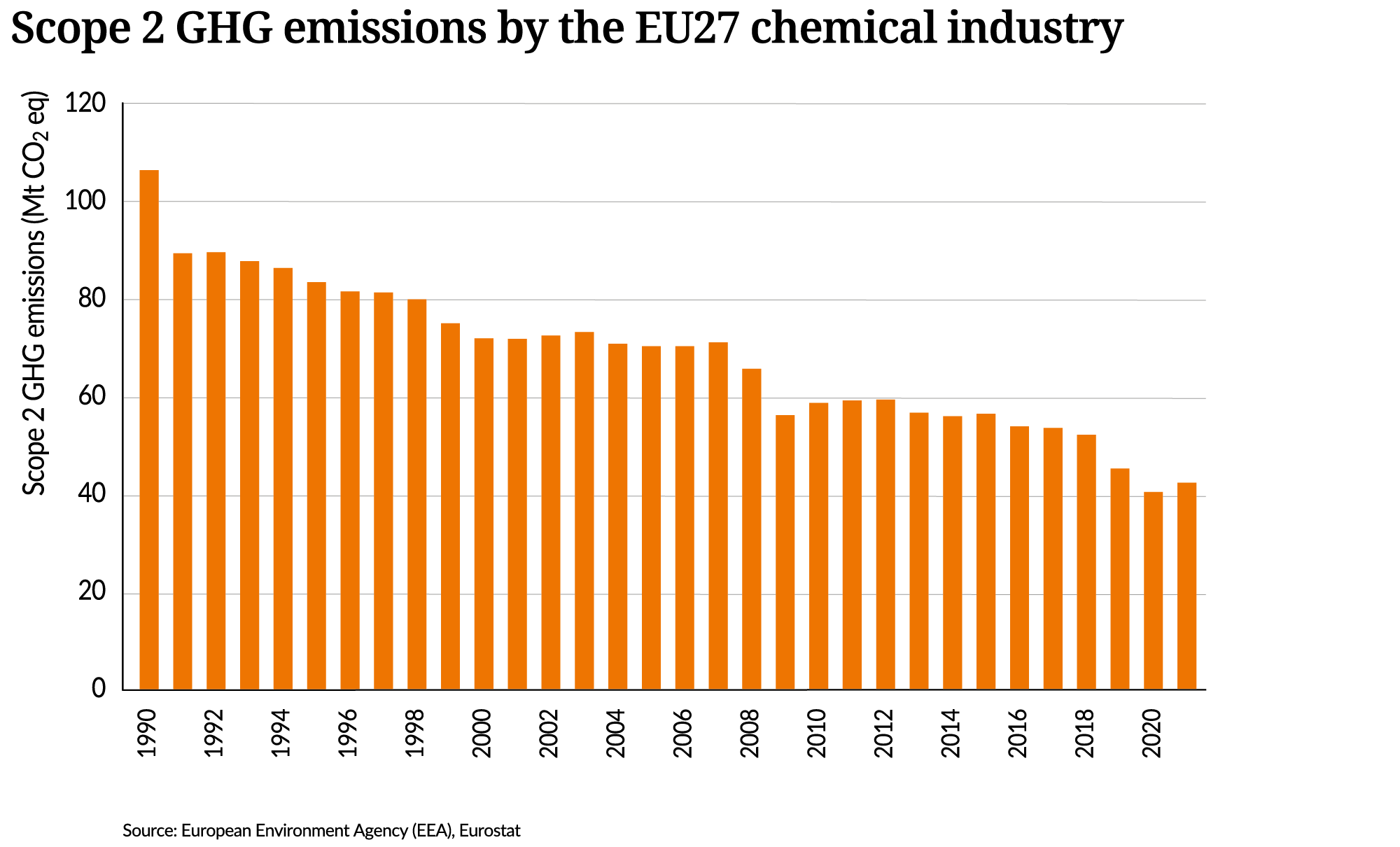 Chemical companies can reduce scope 2 GHG emissions by striving for power contracts with a higher share of low-carbon electricity. Many have already signed Power Purchase Agreements to increase their consumption of low-carbon electricity. However, this may not always be accurately reflected in the calculations of sector scope 2 GHG emissions, as they rely on the average GHG emission factors for the electricity mix of individual member states. Therefore, this method has limitations, as it is challenging to differentiate between the transition to low-carbon electricity by our sector and that of other sectors in the different member states.
