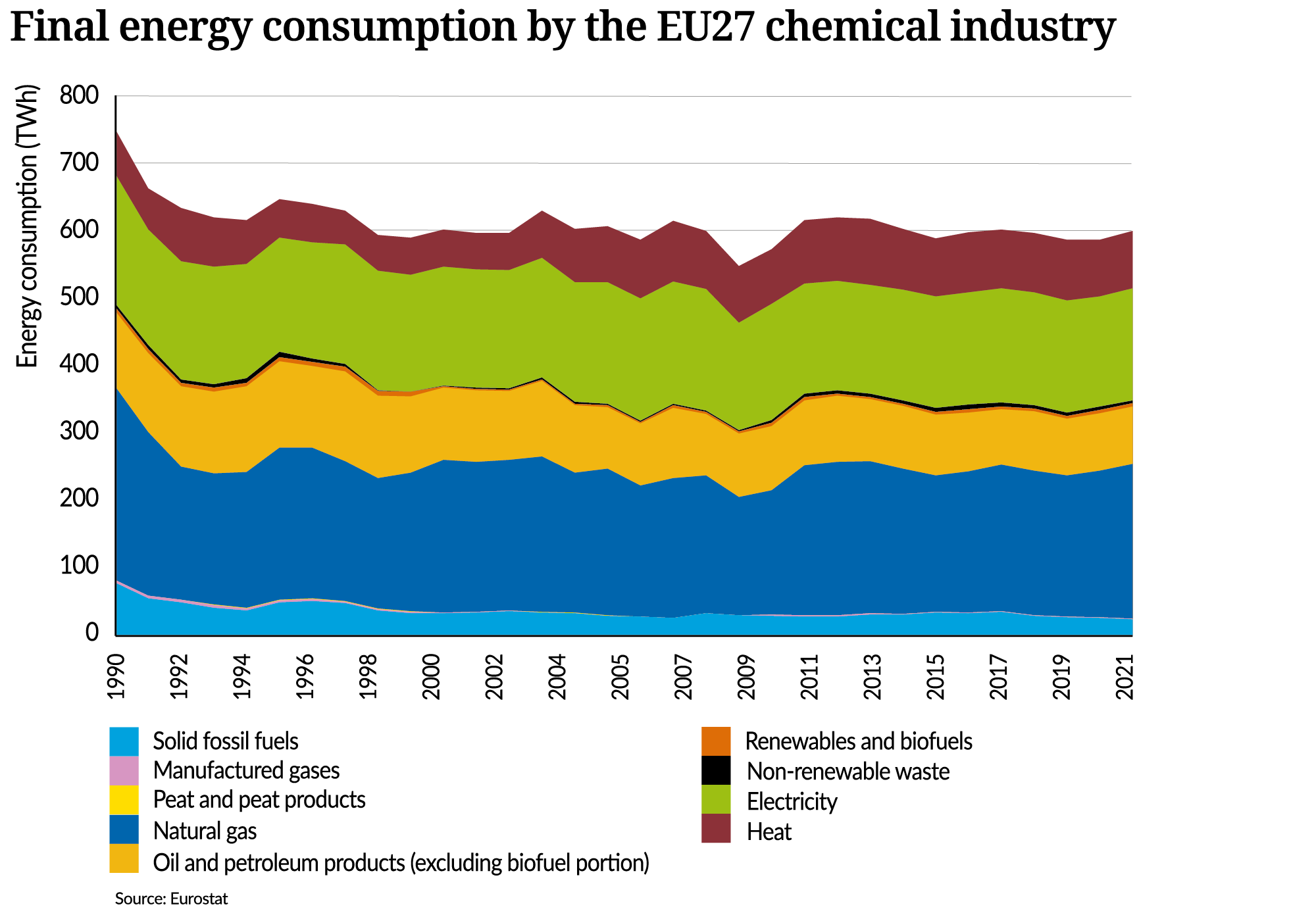 Significant advancements in energy efficiency and energy recovery in production processes have lowered the total energy consumption in the chemical and petrochemical industry, despite a sharp rise in the production index (53% by 2021). Natural gas and electricity are the primary energy sources, accounting for 38% and 28% respectively in 2021. Oil and petroleum products used as energy source *peaked in the late nineties but decreased slowly during the last two decades to around 15%. Energy consumption out of solid fossil fuels was relatively low in 1990 and decreased further by 69% over the period 1990-2021. As we move towards climate neutrality, electricity consumption is projected to rise. Ensuring ample availability of low-carbon electricity will be crucial.