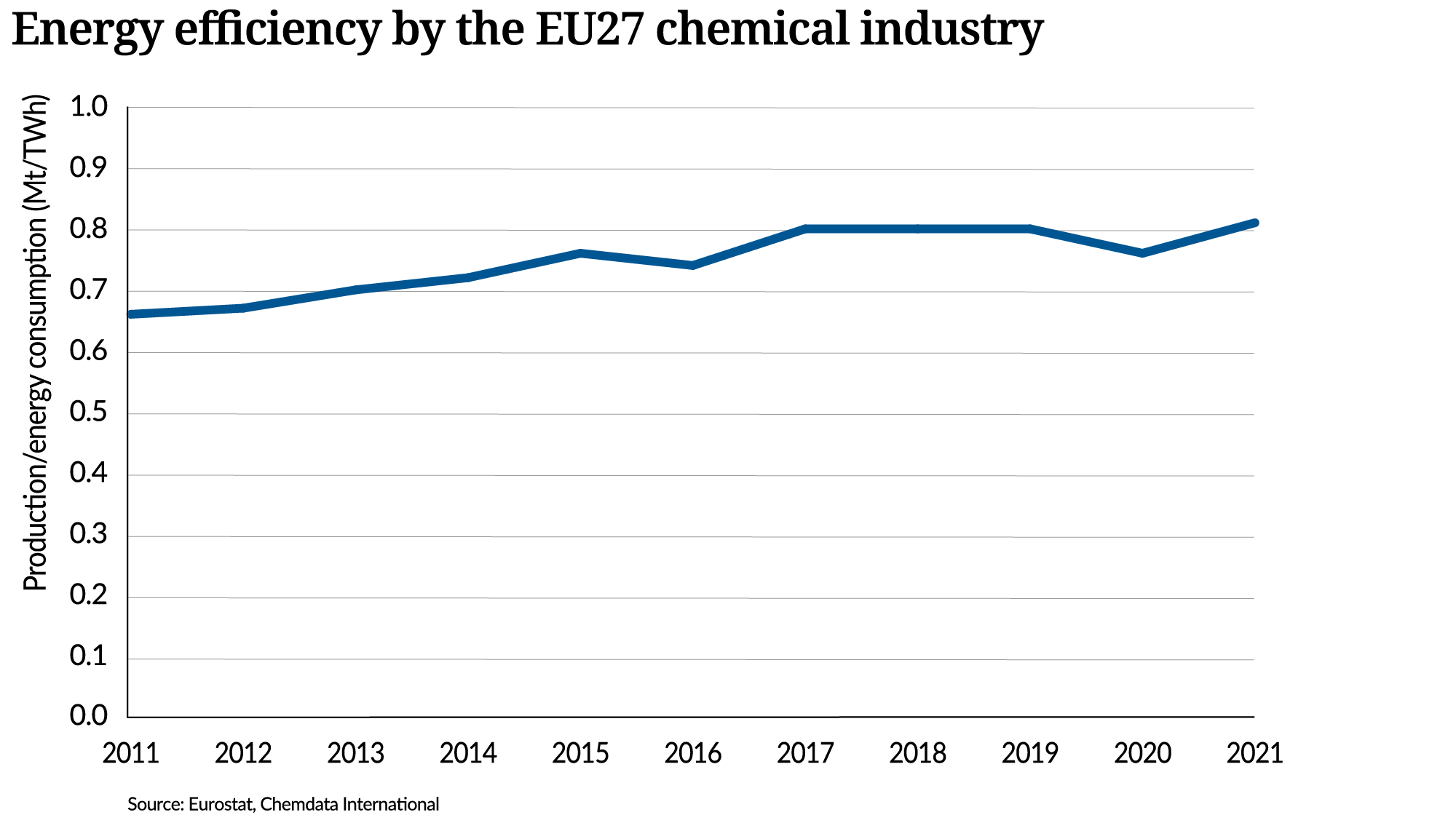 The energy efficiency of the European chemical industry improved over the period 2006-2021, with a 22% increase. Global economic crises in 2016 and 2020 had a negative impact on the energy efficiency of the production processes. During crises, decreased production can lead to sub-optimal operation of installations , affecting energy efficiencies. This is confirmed by lower production volumes in weight in 2019 and 2020.