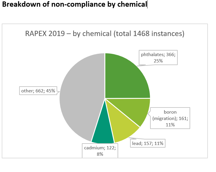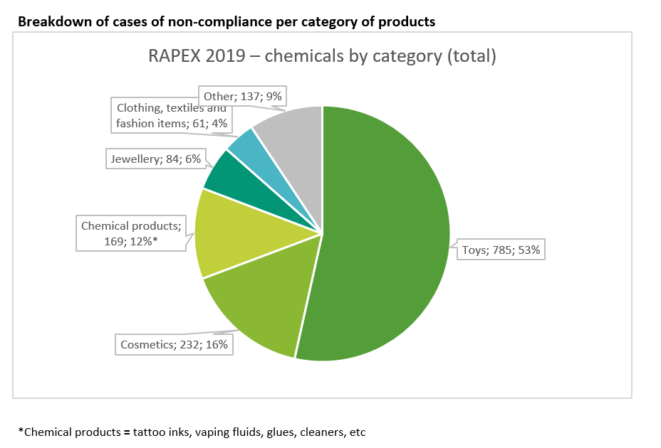 This analysis is based on the Commission’s 2019 RAPEX data, broken down to individual chemicals. Through the Safety Gate Rapid Alert System for dangerous non-food products (RAPEX), EU/EEA member states and the European Commission exchange information about products posing a risk to health and safety of consumers. In 2019, RAPEX listed 1468 instances of chemicals that were not in compliance with the law.