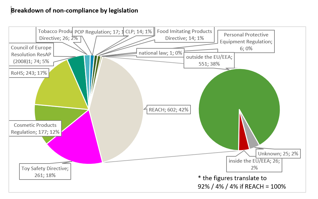 - 92% of chemicals non-compliant with REACH in consumer products come from outside the EU/European Economic Area (EEA)